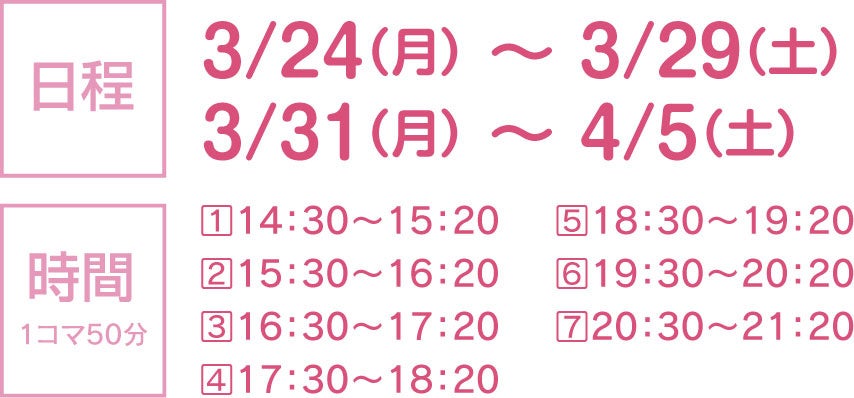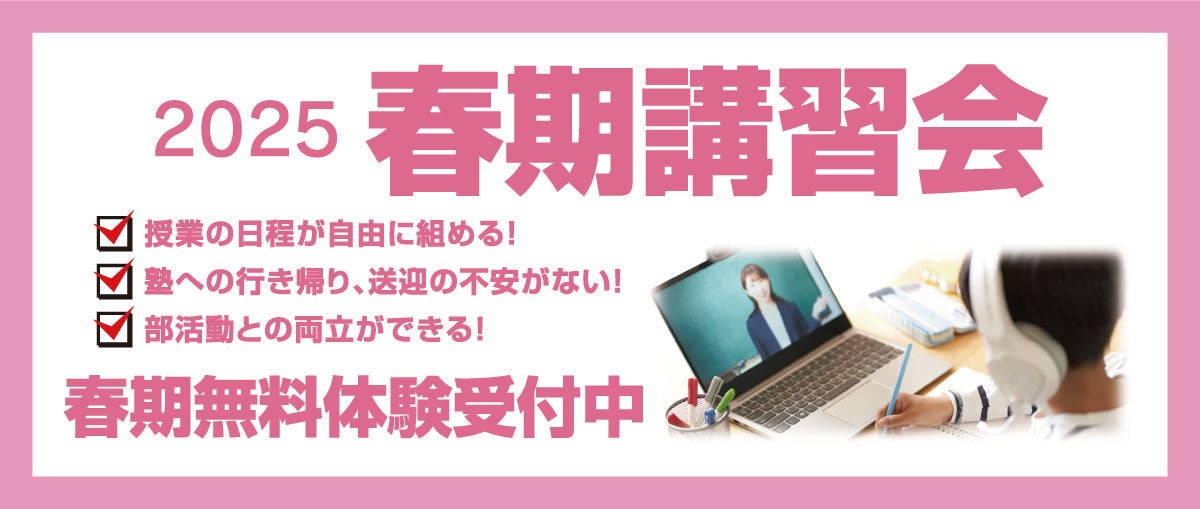 完全1対1のオンライン個別指導の春期講習会! 授業の時間を自由に決められ、質の高い授業をお家に居ながら受講することができます!