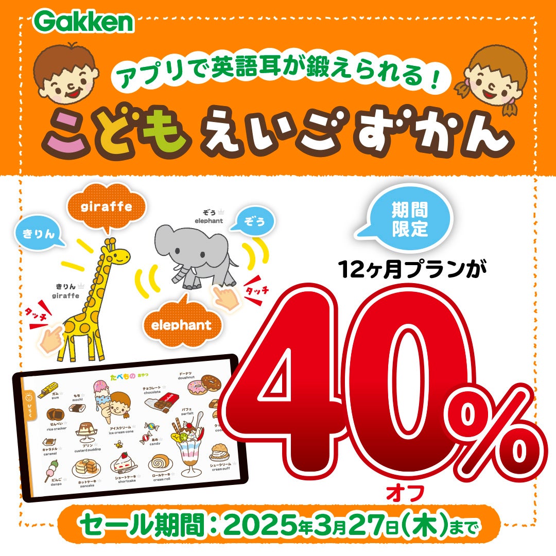 株式会社 学研ホールディングス(東京・品川/代表取締役社長:宮原博昭)のグループ会社、株式会社Gakken(東京・品川/代表取締役社長:南條達也)は、iOS用アプリ『こどもえいごずかん』にて、2025年3月14日(金)~3月27日(木)の間、12ヶ月プランが40%OFFで購入できる期間限定セールを実施いたします。