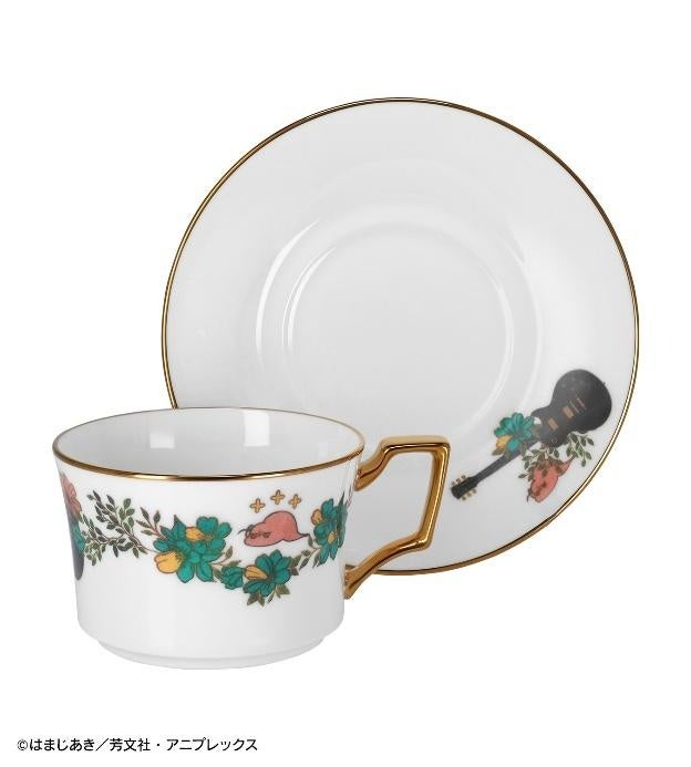 ツチノコぼっちと後藤ひとり愛用のギターがポイントの、日常使いしやすいボタニカルデザインのカップ&ソーサーです。