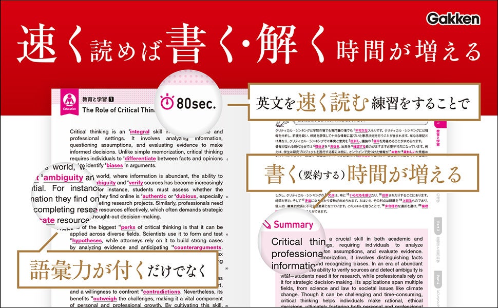 また、2024年6月の英検から【英作文の要約問題】が導入されました。英作文では「書く力」、要約問題では「長文を読む力」も求められます。長い英文を速く読めるようになると、文脈の中で語彙を「生きた言葉」として吸収できます。また、要約問題に割ける時間も増やせます。本書では単語の知識はもちろん、英検でよく出題されるテーマの長文を通して【速読力・語彙力・要約力】を強化し、英検合格をサポートします。