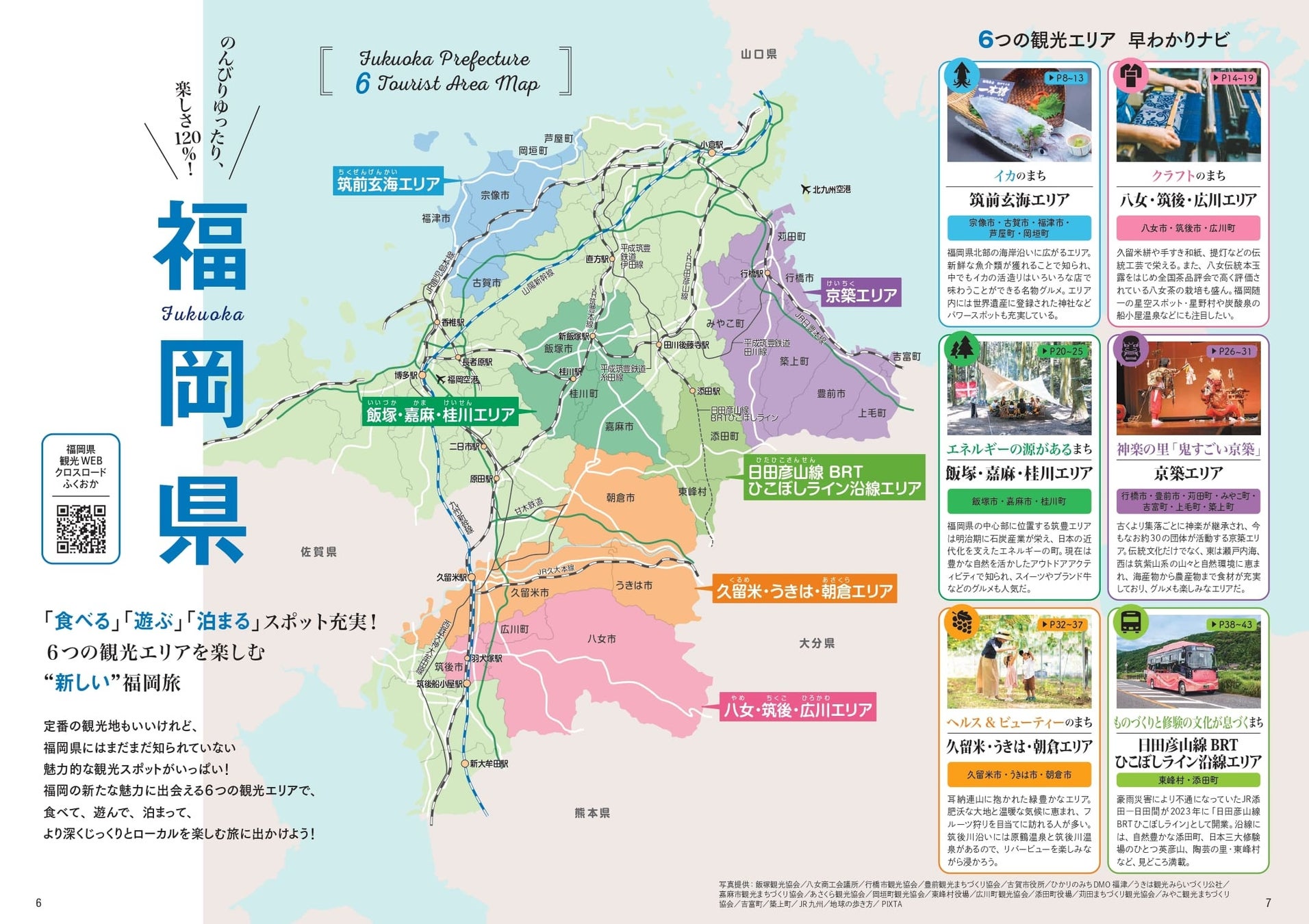 本冊子では、6つの観光エリアの体験やグルメ、観光スポットなどを48ページにわたってご紹介しています。また、「食べる」「遊ぶ」「泊まる」を組み合わせたモデルコースや、エリアごとの詳細なアクセスが分かるマップも掲載しており、手に取った方が福岡県を訪れたくなる、魅力が詰まった一冊となっています。本冊子を通じて新たな福岡県の魅力を知っていただき、これまでとはひと味違うディープな福岡旅行を楽しんでいただくことを期待しています。