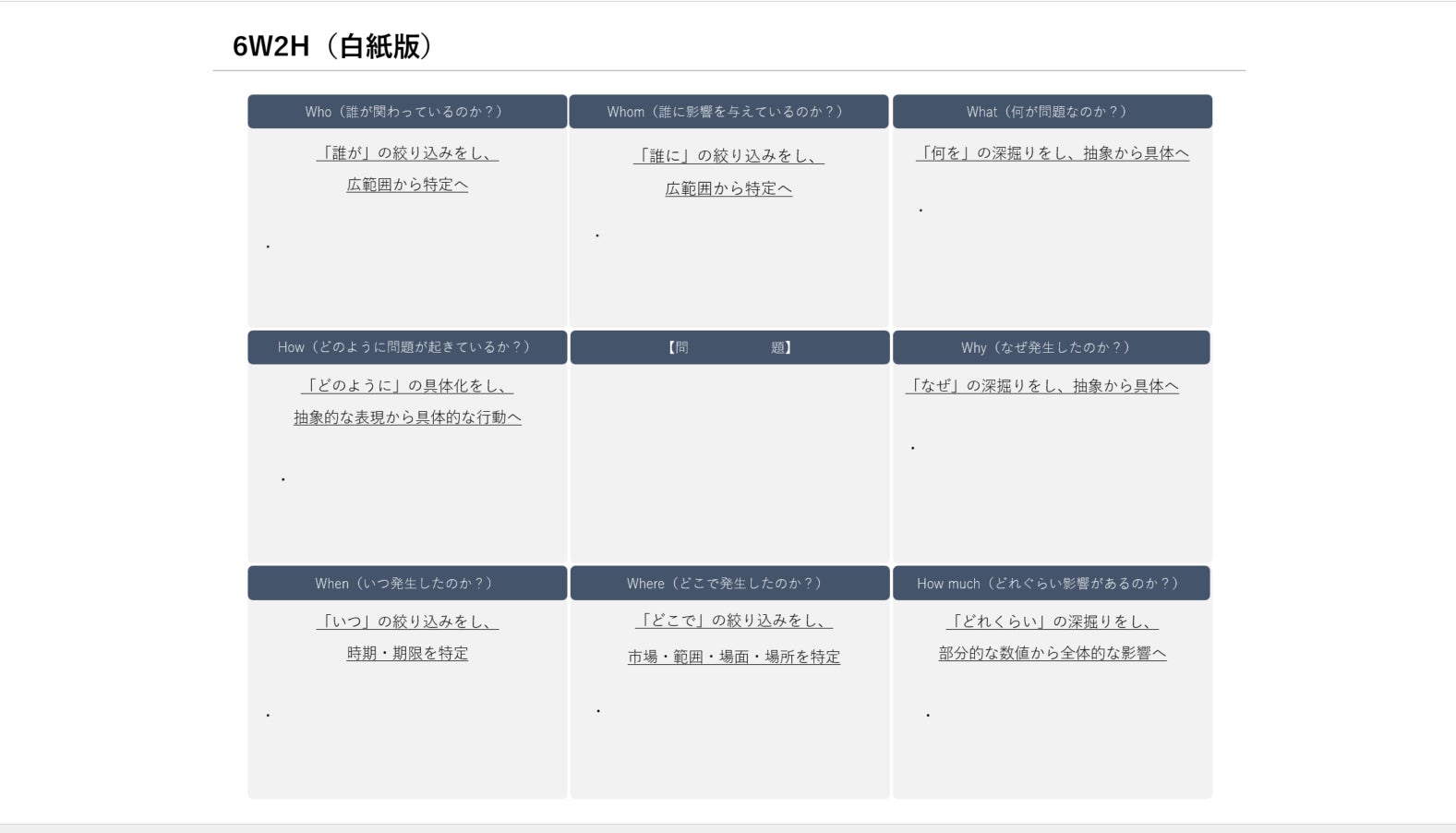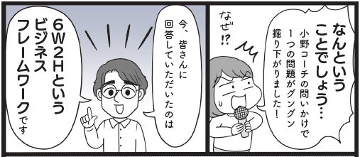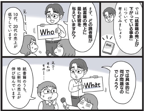 小野コーチは書籍の売上低迷に関する問題点を6W2H、つまり「いつ、どこで、誰が、何が、なぜ、誰に、どのように、どのくらい」という切り口から、より深く掘り下げていきます。