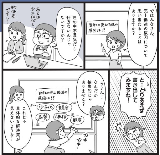 ゆうみさんは書籍の売り上げ低迷をうけて、会議を開くことに。社員からでたさまざまな意見を書き出して、その原因を突き止めようとします。しかし、意見を集めても「不景気だから」「少子化だから」と抽象的なコメントが続き、話し合いが迷走していきます…。