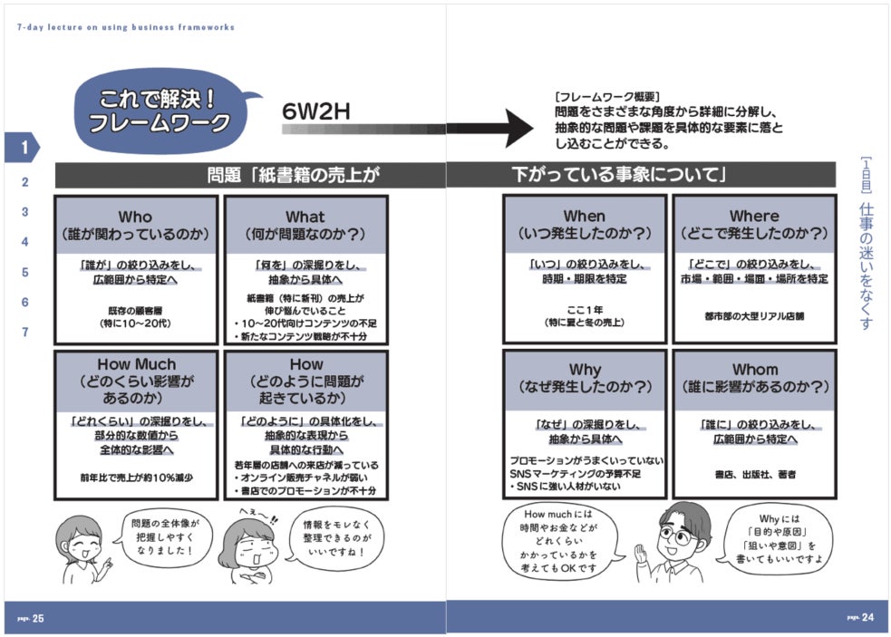 本書ではビジネスフレームワークを、知識ゼロからたった7日間、マンガを読むだけで楽しく学ぶことができます。「ほかの本で挫折してしまった」「研修でやったけど自分では使えない」という方にもおすすめです。