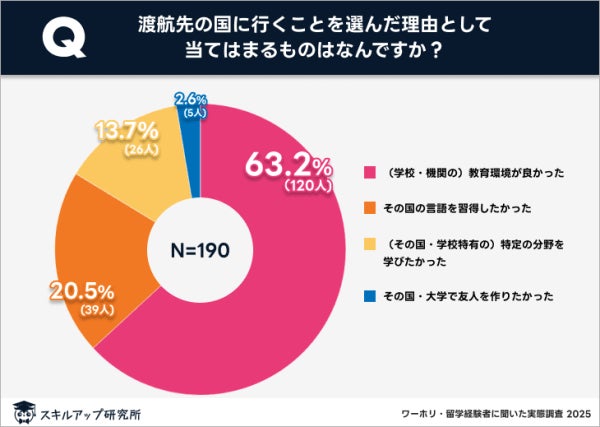 調査結果によると、留学・ワーホリ先を選んだ理由として最も多かったのは「(学校・機関の)教育環境が良かった」という回答で、63.2%の人がこれを選んだ。