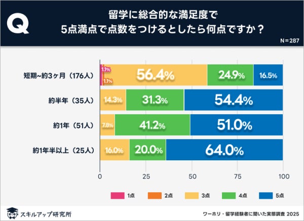短期(約3ヶ月)の留学では、56.4%が「3点」を付け、満足度が中程度である一方で、約半年以上の留学になると、「5点」と評価した人が増加する。