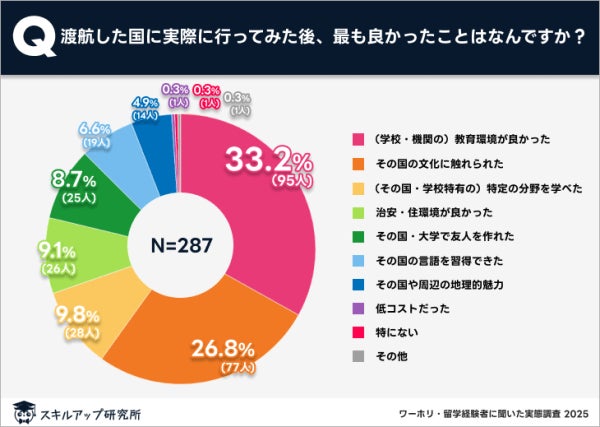 調査結果によると、留学・ワーホリ先で最も良かったこととして最も多かったのは「(学校・機関の)教育環境が良かった」(33.2%)である。