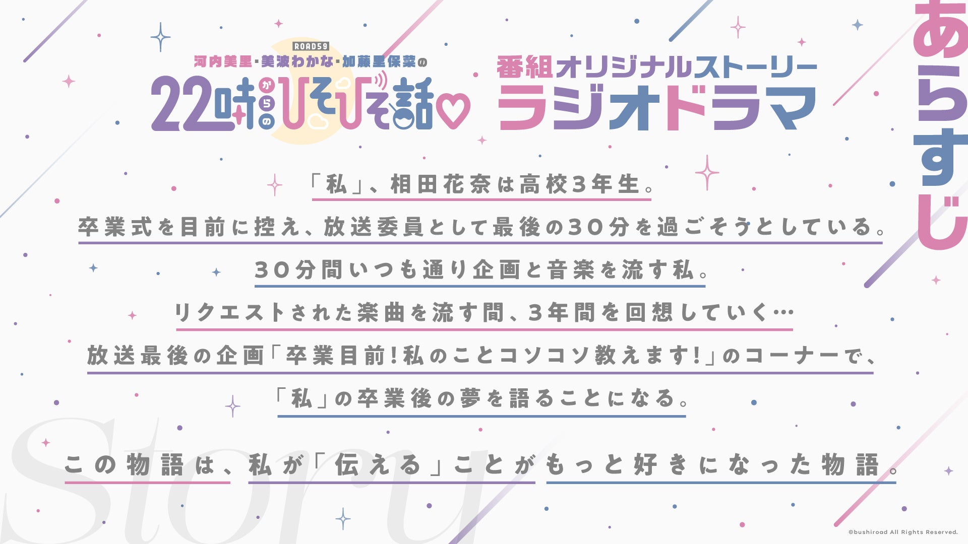 ラジオ番組「ROAD59 河内美里 美波わかな 加藤里保菜 の22時からのひそひそ話♡」の12月24日(日)放送回にて、番組オリジナルストーリーのラジオドラマ「プレイバックマイエトセトラ」の放送が決定しました。