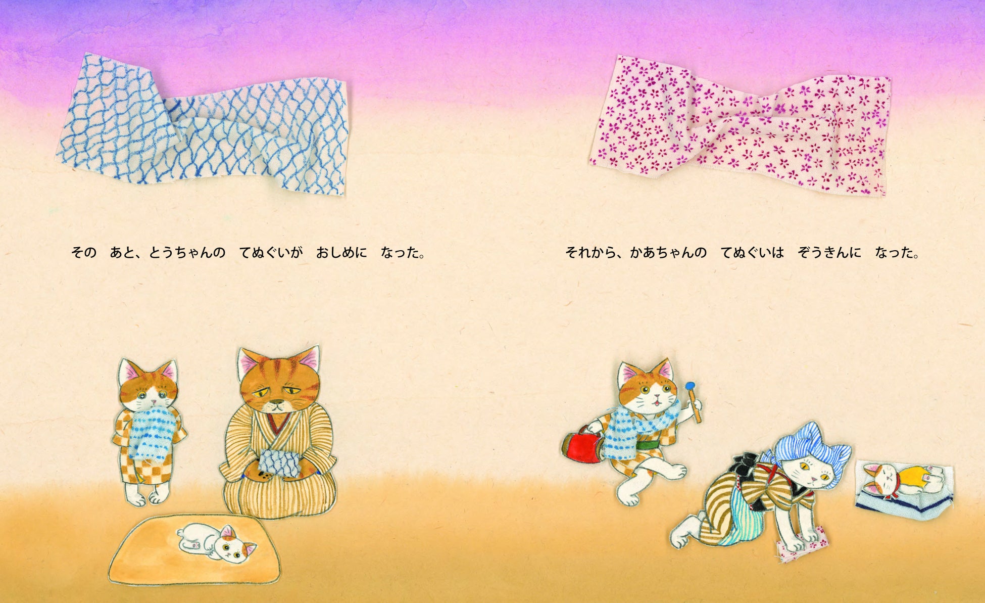 そして、出来上がった絵本は、驚いたことに「手ぬぐい」が主人公。そして、目も鼻もついていません。主人公としての存在感を出すために、作者のかとうさんは、場面にでてくる手ぬぐいを布でひとつひとつ手作りしたものを絵に貼り付けて立体感を出しています。しかも、その手ぬぐいは「豆絞り」柄! すべてに点々の柄を付けていったという、普通に絵を描くより数倍も手間がかかっています。