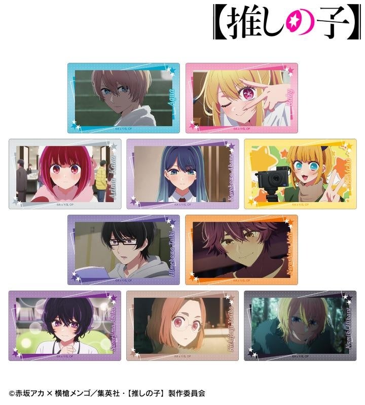 アクア、ルビー、有馬かな、黒川あかね、MEMちょ、姫川大輝、鳴嶋メルト、鮫島アビ子、吉祥寺頼子、カミキヒカルの印象的なシーンをカードステッカーに仕上げました。