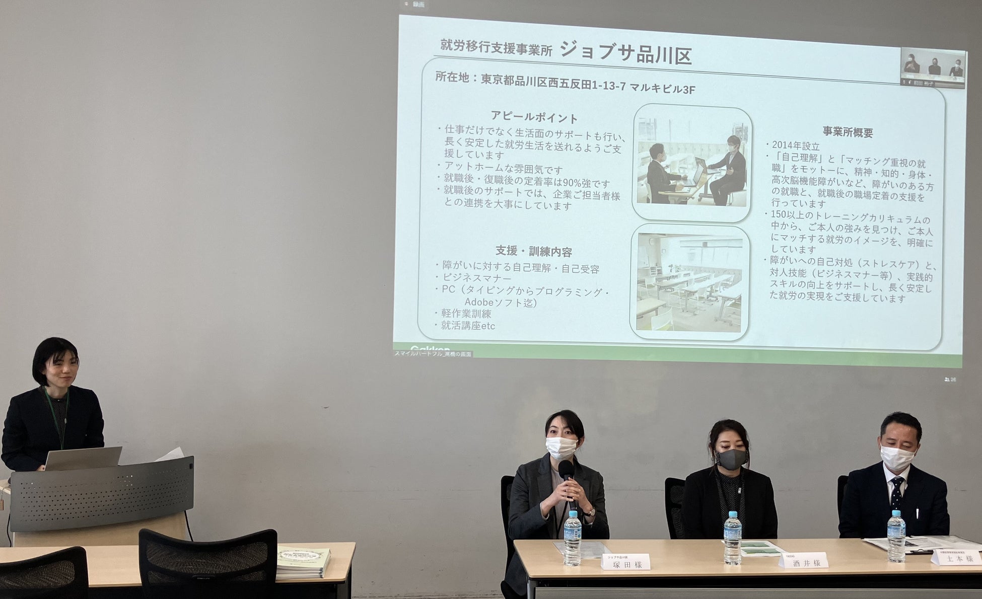 学研スマイルハートフルは、学研グループ各社に対して、障がい者の採用・定着支援活動を行っています。その一環として、毎月、情報共有会を実施しており、2月は「支援機関と企業や障がい者との繋がり」をテーマに講演会を開催しました。就労移行支援事業所 ジョブサ品川区、就労移行支援事業所 YASSAS、中野区障害者福祉事業団の担当者が登壇し、各機関の具体的な支援事項を取り上げ、障がい者と企業、それぞれに向けての支援について、お話しいただきました。