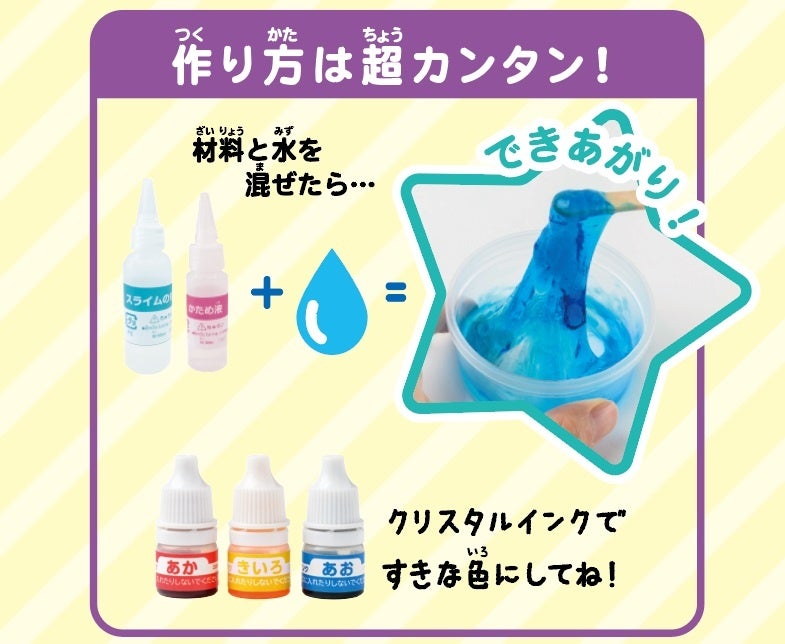 材料と水を混ぜるだけで、あっという間にスライムのできあがり。クリスタルインクを入れて、好きな色に仕上げましょう。材料は全部キットに入っているので、小さなお子さまでも一人でカンタンに作れます。