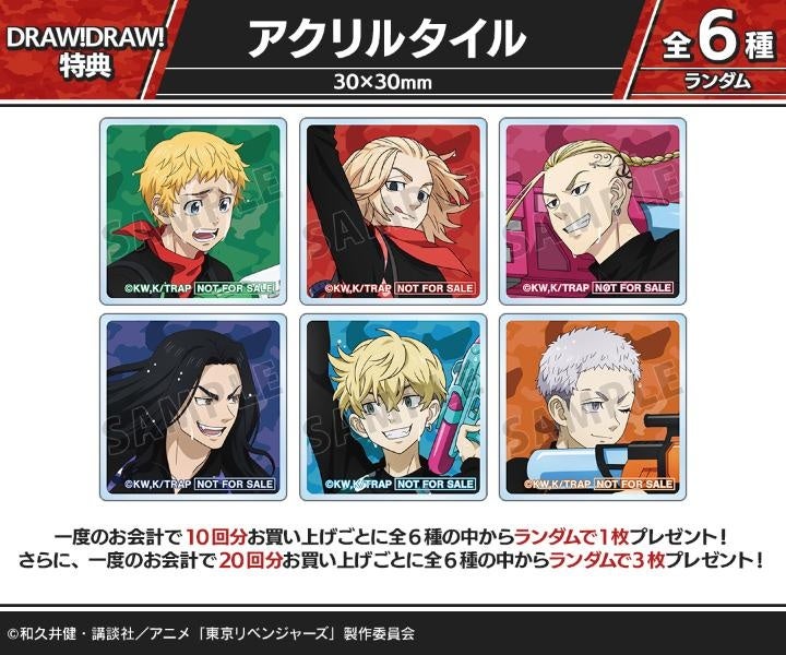 一度のお会計で10回分ご購入ごとに特典アクリルタイル(全6種)をランダムで1枚、20回分ご購入ごとにランダムで3枚プレゼント!