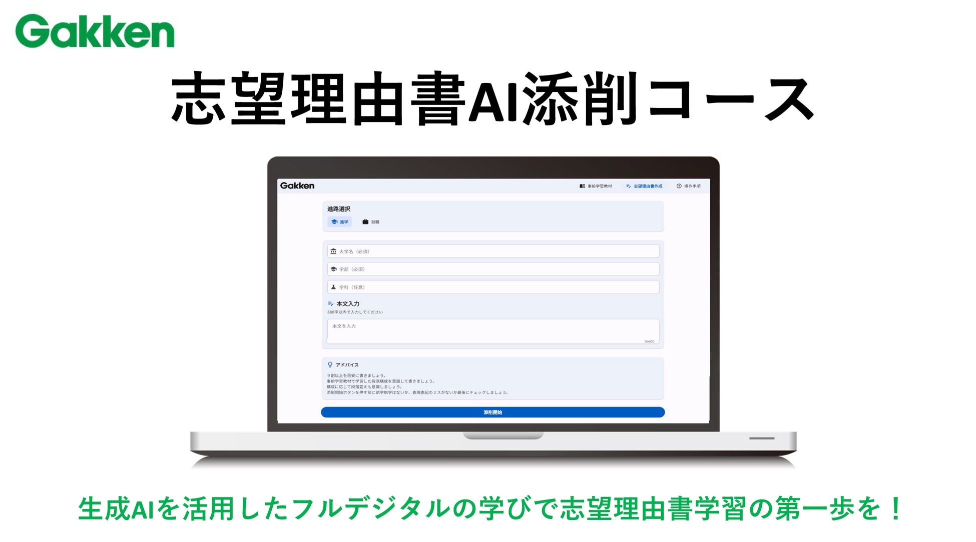 株式会社 学研ホールディングス(東京・品川/代表取締役社長:宮原博昭)のグループ会社、株式会社Gakken(東京・品川/代表取締役社長:南條達也)は、高等学校向けデジタル添削教材「志望理由書AI添削コース」を2025年4月1日(火)より販売開始いたします。添削指導にAIを活用することで、短時間で添削結果を確認でき、改善点を理解して文章を推敲することができます。