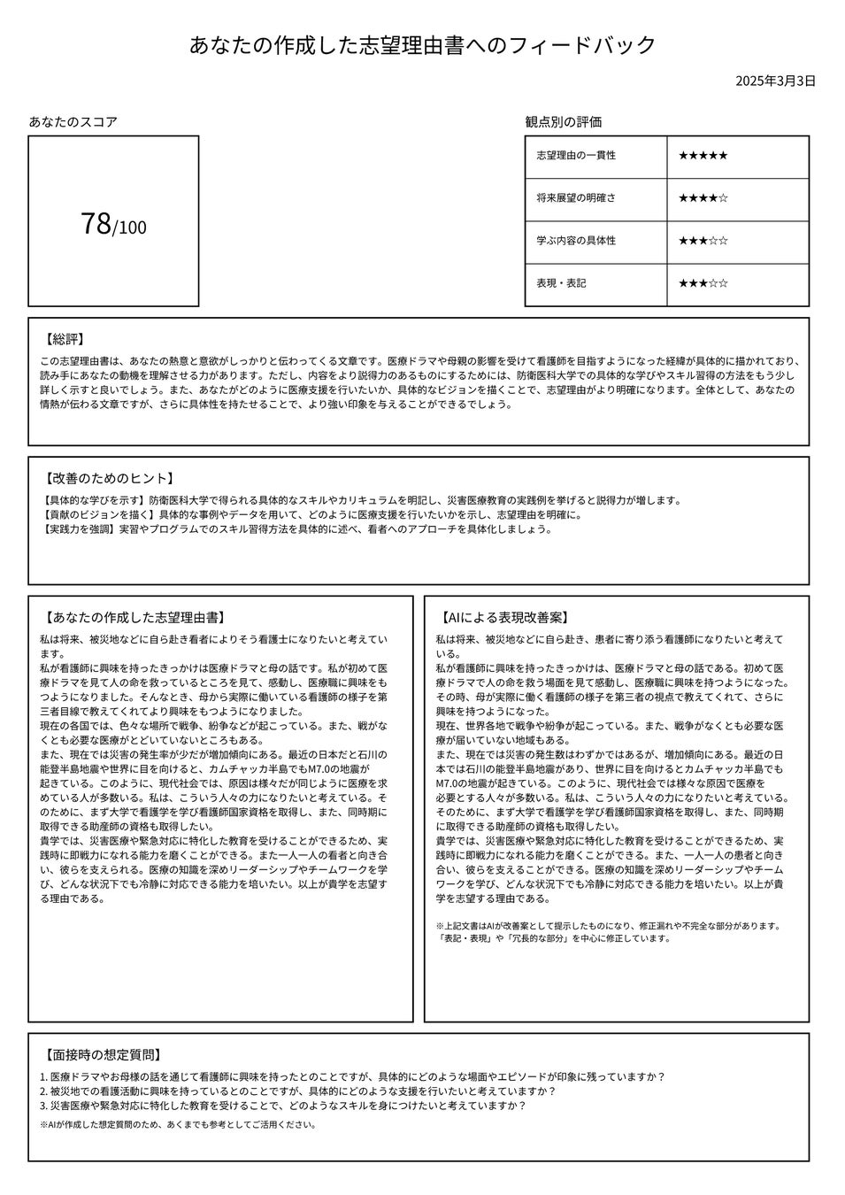 面接試験時に志望理由書に基づいた内容を質問されるケースが多いことから、文章内容を元にした【面接時の想定質問】も参考例としてフィードバックされます。