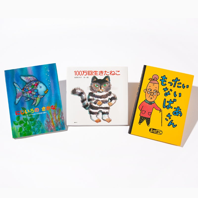 講談社の誇る不滅のロングセラー『100万回生きたねこ』『もったいないばあさん』『にじいろのさかな』は、子どもが本好きに育つ決定版セット。何度も読み返し、おとなになっても持っていたい名作ぞろいです。佐野洋子さんの『100万回生きたねこ』は、愛する人に送りたい永遠の名作絵本。読むたびにちがう気持ちになる、りっぱなとらねこの、ふしぎな物語。親子や家族で読み継ぎたい名作です。『もったいないばあさん』は、ものを大切にする心が育つ、ベストセラーの第一作。MOTTAINAIは、今や世界に通じる言葉になりました。『にじいろのさかな』は世界中で3000万人以上の読者に愛読された大ベストセラーシリーズの第一作。谷川俊太郎の名訳が光ります。虹色に輝くうろこをもった特別なさかな、にじうおは、そのきらきらしたうろこを、一枚欲しいという友達に、あげることができるのでしょうか。