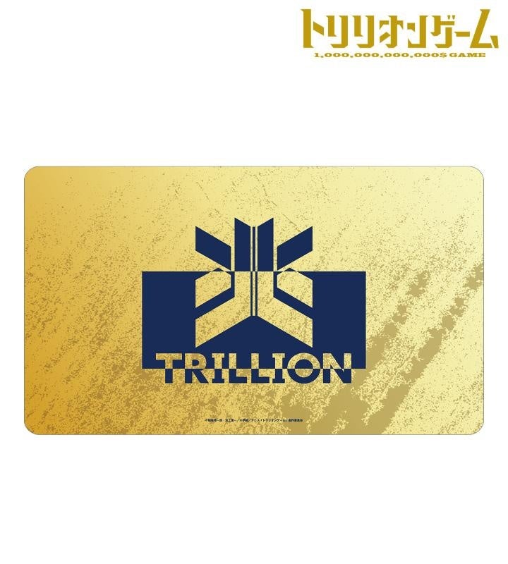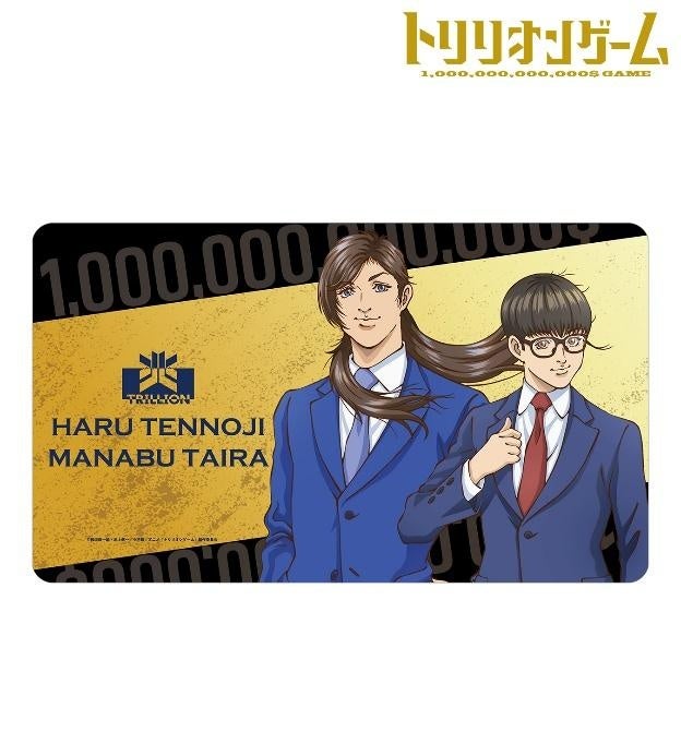株式会社トリリオンゲームのロゴ、天王寺陽、平学のイラスト、キャラクターの名前をマルチデスクマットに仕上げました。