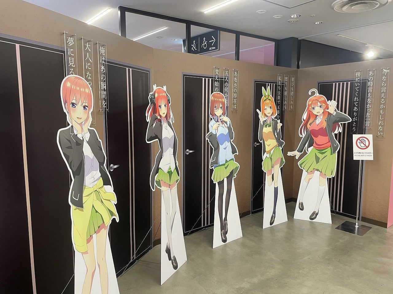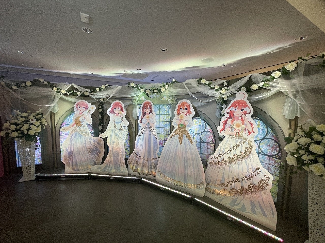 最後の映画『五等分の花嫁』エリアでは、劇場で見せた五つ子たちの様々な表情をクローズアップ。劇場版は物語の完結まで描いた作品であり、ファンにとっても思い入れの強いシーンの数々を振り返ることが可能です。また、エリアの最後には展示のフィナーレとなる、花嫁衣装の描き下ろしイラストに金箔加工を施した等身大パネルが設置されています。