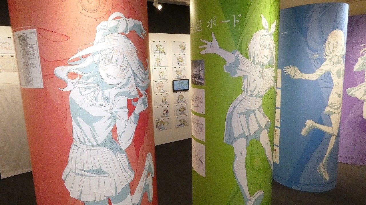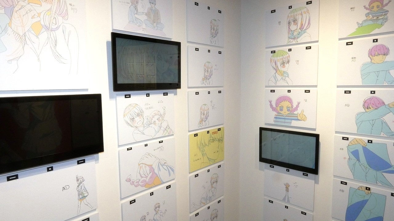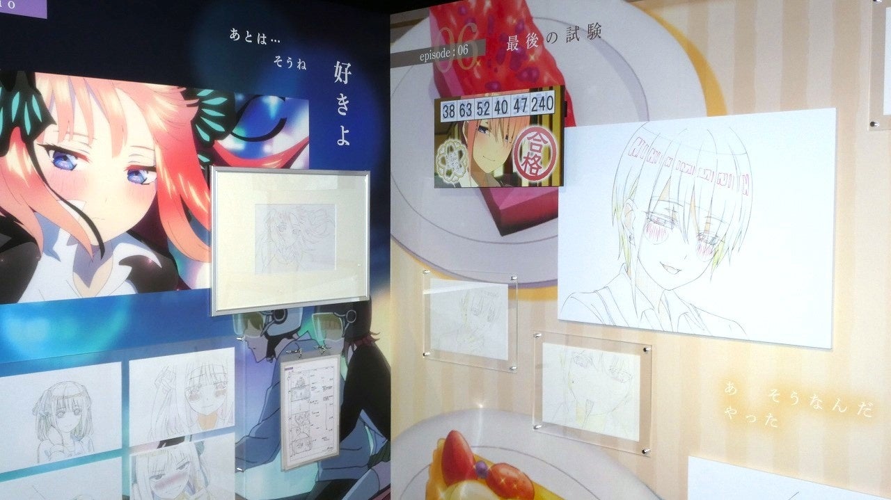 続いて『五等分の花嫁∽』エリアは、アニメ制作のフローを展示とともに解説。企画段階からキャラクターのデザイン、さらには設定ボードや原画と、映像が出来上がるまでの過程を詳しく知ることができます。もちろん原画の数も膨大で、五つ子たちはもちろん、風太郎やサブキャラクターを含めた魅力的なシーン、コミカルな表情も原画で再確認できます。原画が映像になるまでの過程をまとめた映像もふんだんに用意されているので、イラストとじっくり見比べてみるのもいいでしょう。