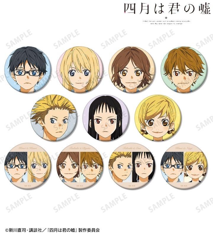 有馬公生、宮園かをり、澤部椿、渡亮太、相座武士、井川絵見、相座凪のイラスト、作品ロゴの花モチーフをマットな手触りの缶バッジに仕上げました。