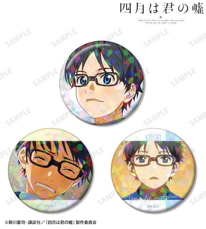 有馬公生、宮園かをり、澤部椿、渡亮太、相座武士、井川絵見、相座凪のイラストをホログラム加工を施した缶バッジに仕上げました。
