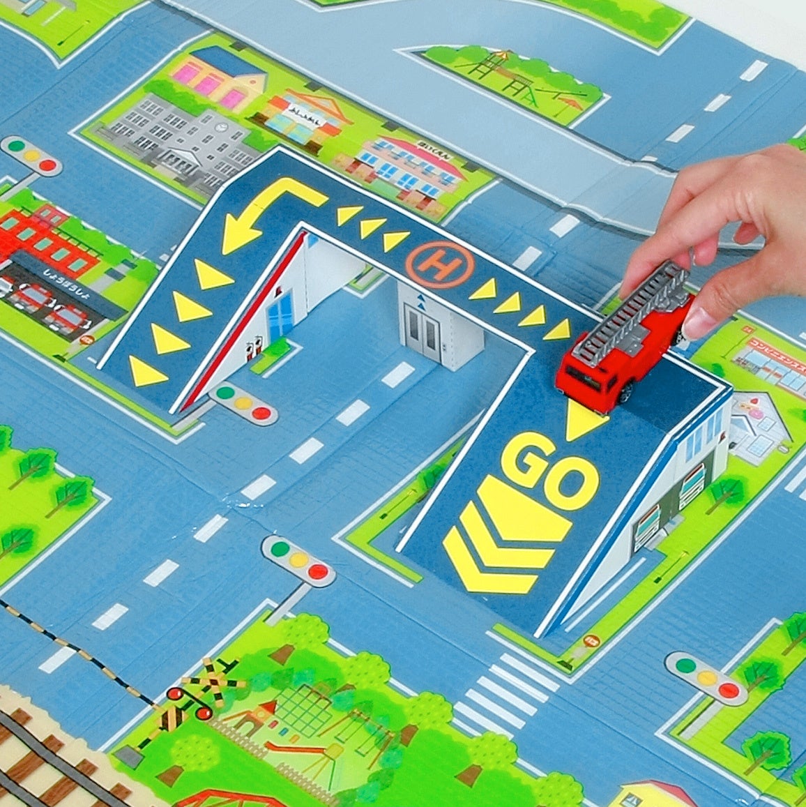 サイレンカーを発車させる「レスキューセンターはっしゃきち」の工作! 付録のレジャーシートの上に置いて、ミニカーを走らせられます♪