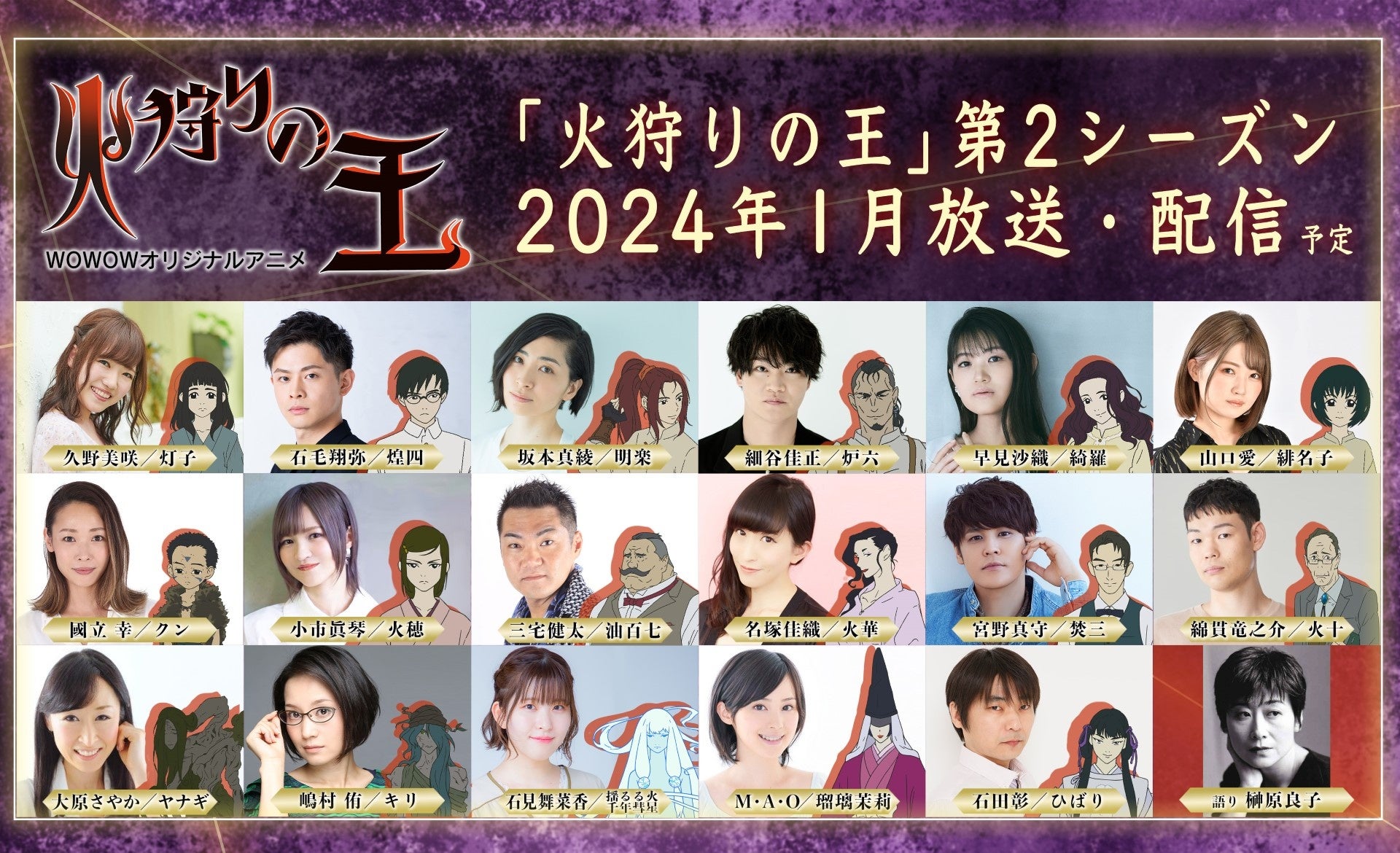日向理恵子による長編ファンタジー小説を、監督・西村純二と構成/脚本・押井守がタッグを組んでアニメ化し、今年1月に放送・配信したWOWOWオリジナルアニメ「火狩りの王」。その先の物語に期待が高まっていたがこの度、「火狩りの王」の第2シーズンが2024年1月に放送・配信スタート(予定)、メインスタッフと声優キャストが公開となった。