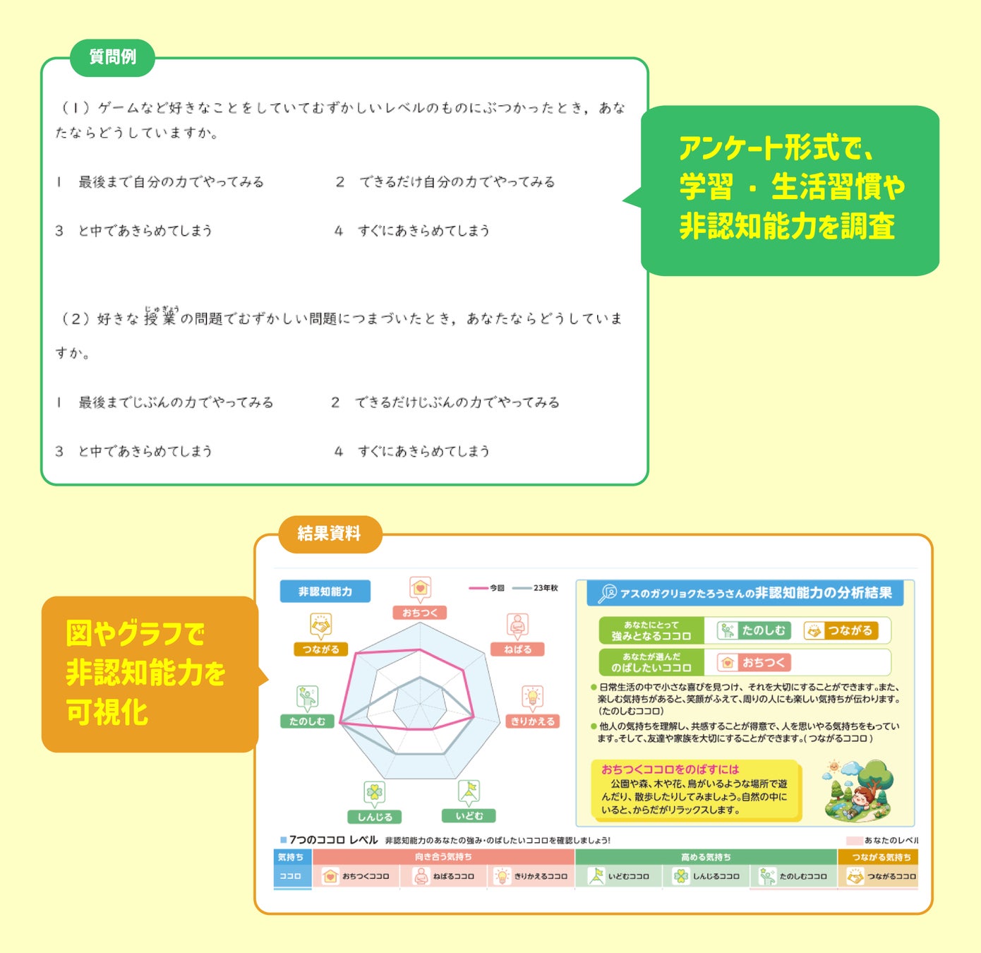 数値化が難しいとされている非認知能力は、グラフや表などで可視化されます。