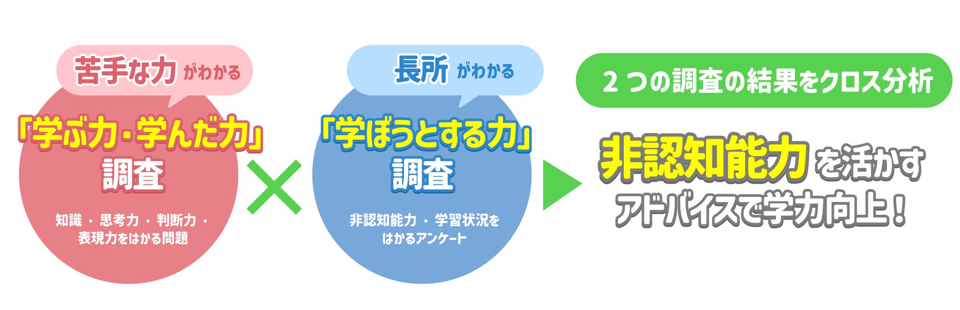 「非認知能力」の診断から分かるお子様の長所を生かして、苦手な力を伸ばすための学習アドバイスを提示することで、学力向上につなげることを目的としています。