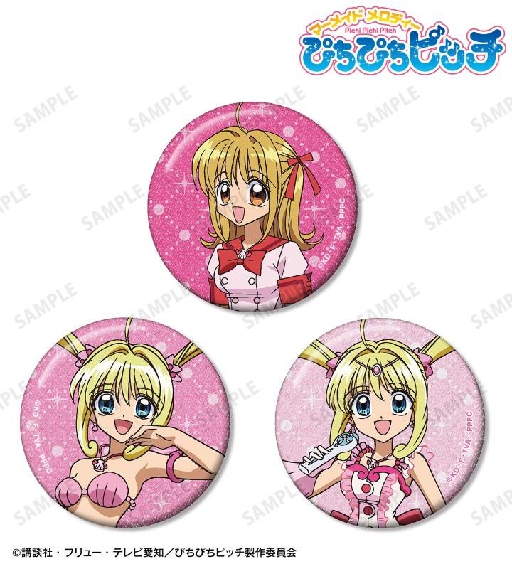 るちあ、波音、リナのイラストをグリッター加工を施した缶バッジに仕上げました。