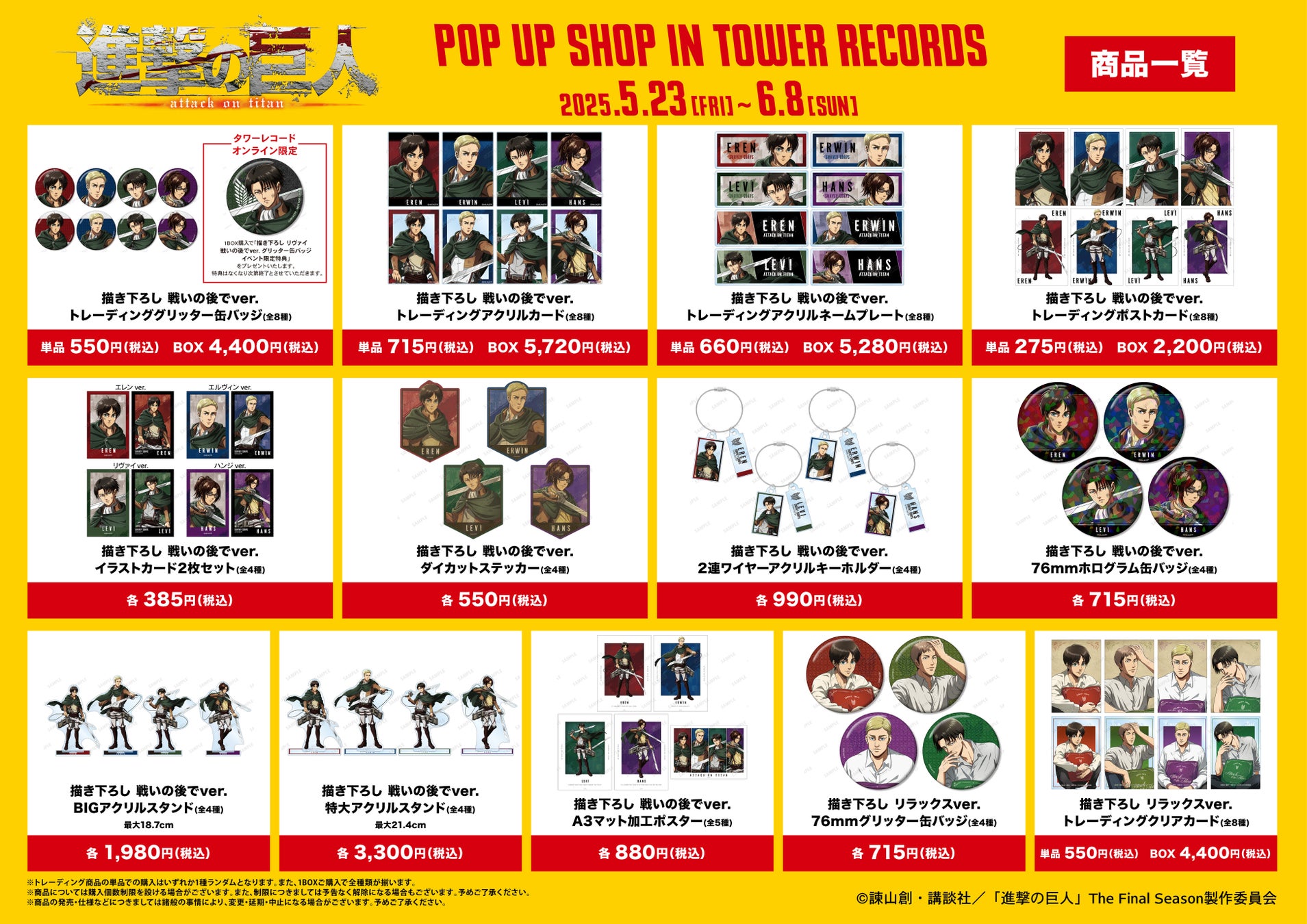 2025年5月23日(金)~6月8日(日)までタワーレコード 新宿店、あべのHoop店、名古屋パルコ店、計3店舗とタワーレコード オンラインにて「TVアニメ『進撃の巨人』 POP UP SHOP in TOWER RECORDS」の開催が決定いたしました。