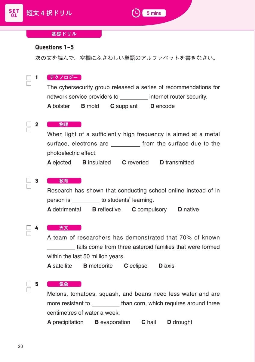 本書では、英語の理解に必要な基本知識を整理しながら、正解を導き出すプロセスを一つ一つ丁寧に解説。正解のポイントはもちろん、間違いの選択肢がダメな理由にも触れ、一問解くたびに濃厚な知識とスキルを獲得できます。記憶に定着する王道サイクルで、短期間で単語集や分厚い文法書一冊分の知識を身に付けましょう。