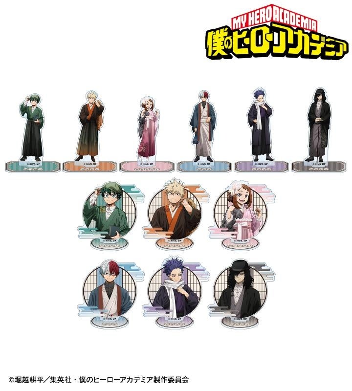 緑谷出久、爆豪勝己、麗日お茶子、飯田天哉、轟焦凍、蛙吹梅雨、切島鋭児郎、上鳴電気、耳郎響香、物間寧人、心操人使、相澤消太、死柄木弔、荼毘、トガヒミコのちびキャラビジュアルをアクリルスタンドに仕上げました。