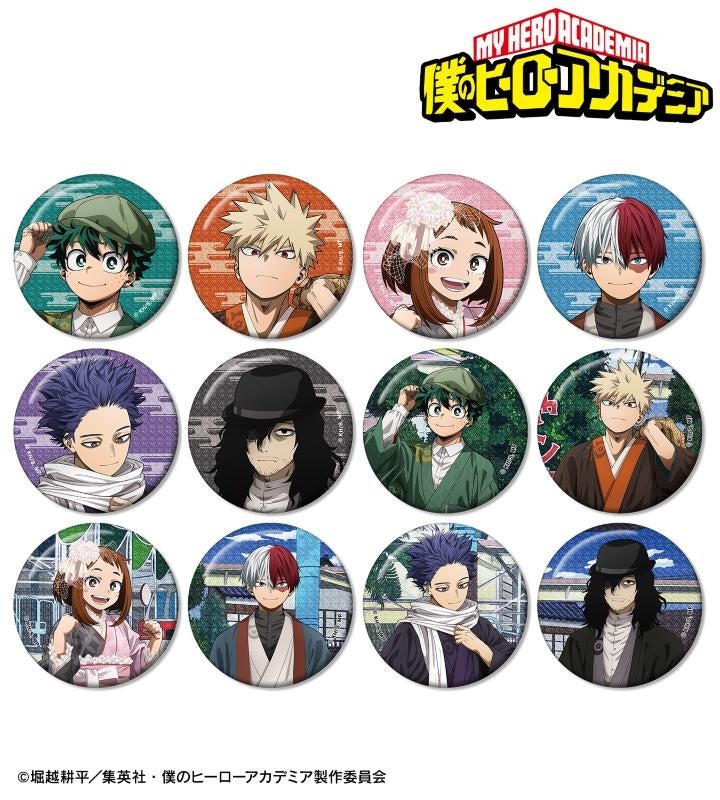 緑谷出久、爆豪勝己、麗日お茶子、飯田天哉、轟焦凍、蛙吹梅雨、切島鋭児郎、上鳴電気、耳郎響香、物間寧人、心操人使、相澤消太、死柄木弔、荼毘、トガヒミコのちびキャラビジュアルをグリッター加工を施した缶バッジに仕上げました。