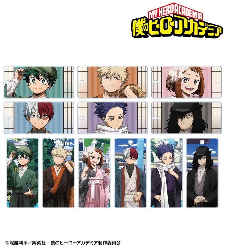 緑谷出久、爆豪勝己、麗日お茶子、飯田天哉、轟焦凍、蛙吹梅雨、切島鋭児郎、上鳴電気、耳郎響香、物間寧人、心操人使、相澤消太、死柄木弔、荼毘、トガヒミコのちびキャラビジュアルをアクリルキーホルダーに仕上げました。