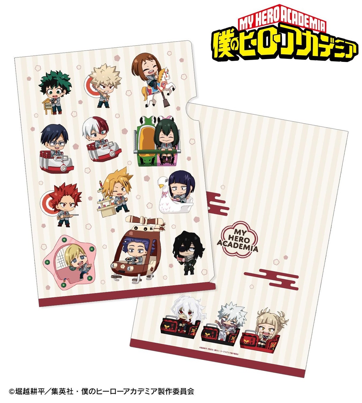 緑谷出久、爆豪勝己、麗日お茶子、飯田天哉、轟焦凍、蛙吹梅雨、切島鋭児郎、上鳴電気、耳郎響香、物間寧人、心操人使、相澤消太、死柄木弔、荼毘、トガヒミコのちびキャラビジュアルをクリアファイルに仕上げました。