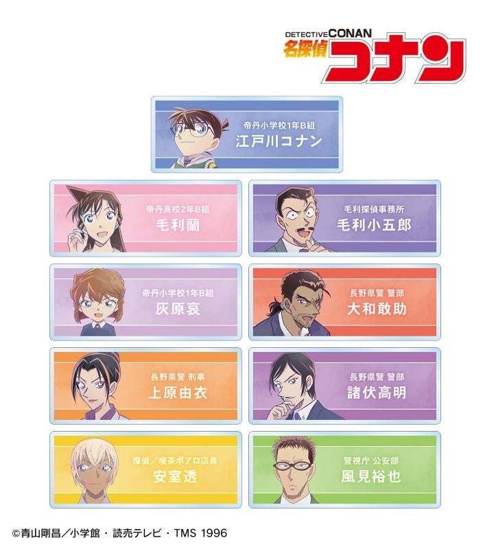 江戸川コナン、毛利蘭、毛利小五郎、灰原哀、大和敢助、上原由衣、諸伏高明、安室透、風見裕也のイラストを新たなタッチで魅力的に表現し、アクリルネームプレートに仕上げました。