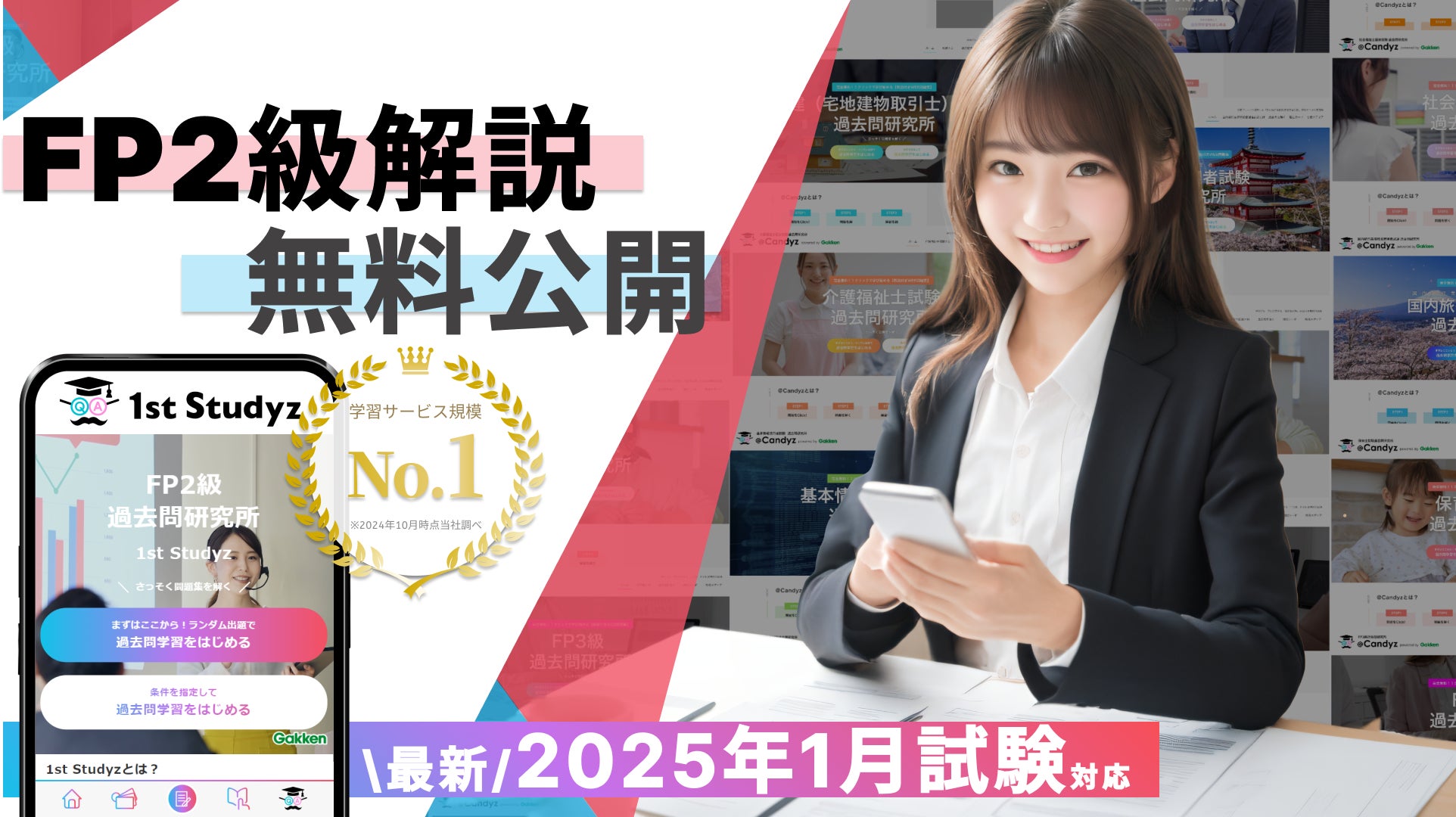 【22サービス10万問】が【すべて無料!】スキマ時間に学べる国内最大の資格学習プラットフォーム「1st Studyz」にて、「FP2級・2025年1月試験」の問題と解説の公開を開始しました!