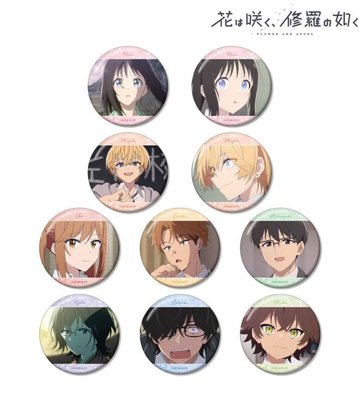 春山花奈、薄頼瑞希、夏江杏、冬賀萩大、秋山松雪、整井良子、箱山瀬太郎、猫井未唯子の印象的なシーンを缶バッジに仕上げました。