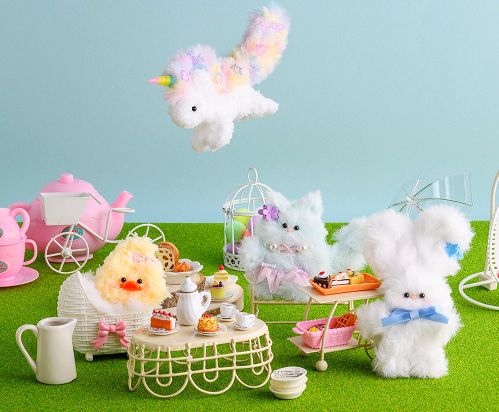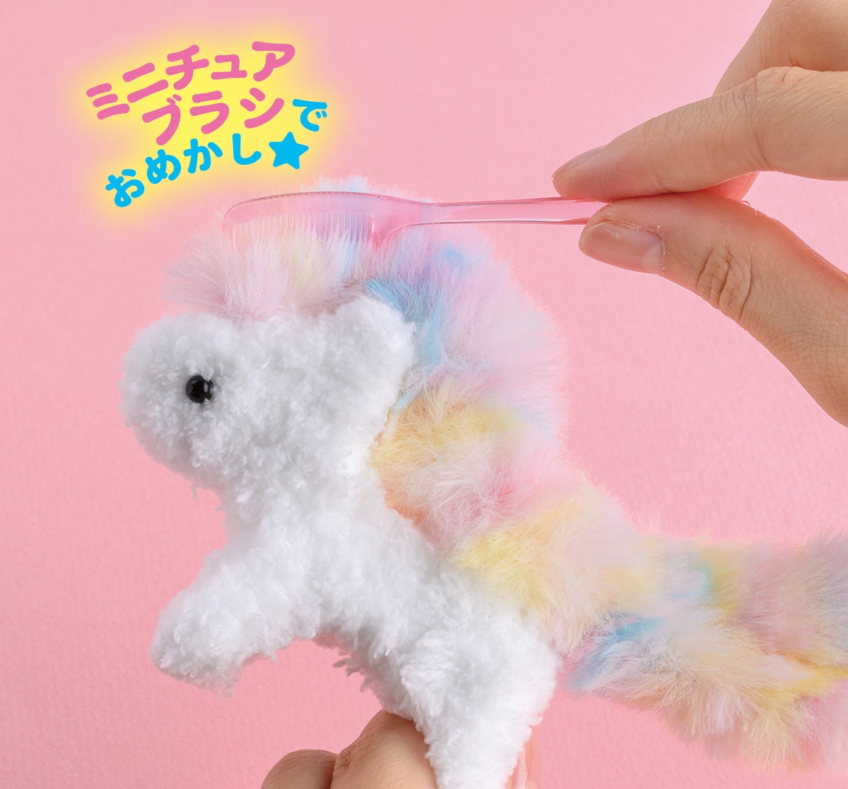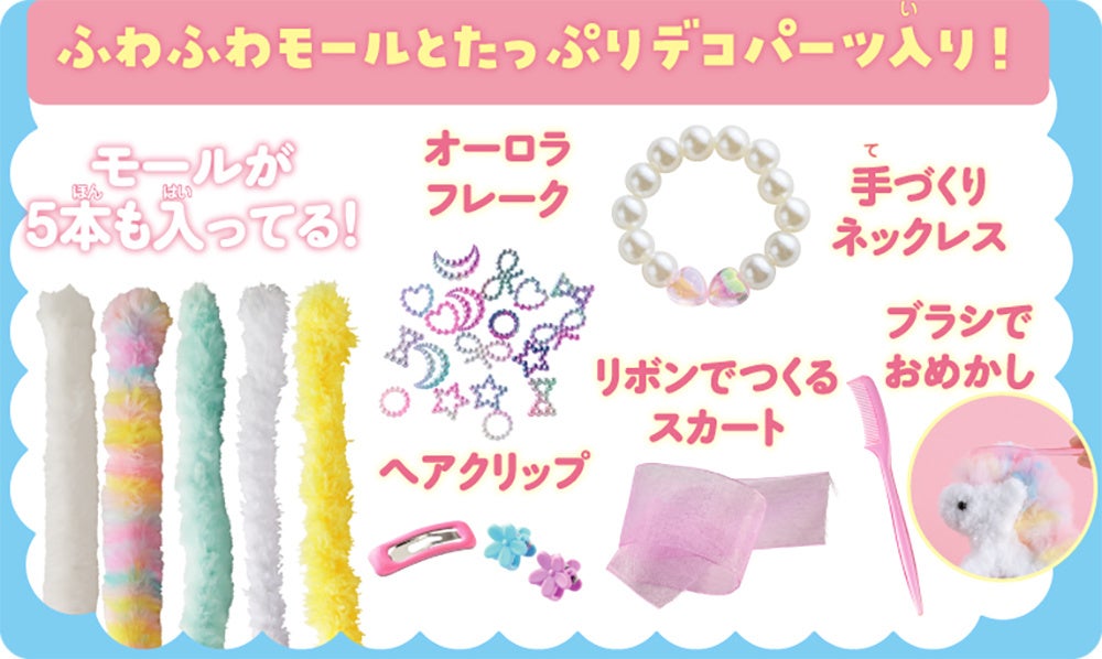 必要なものは全部入り! キットひとつで「うさぎ」「ユニコーン」「ねこ」「あひる」の4つのもふかわドールが簡単に作れます。付属のミニチュアブラシで、かわいくおめかししたら、お気に入りのドールと一緒にお出かけしたくなること間違いなし。