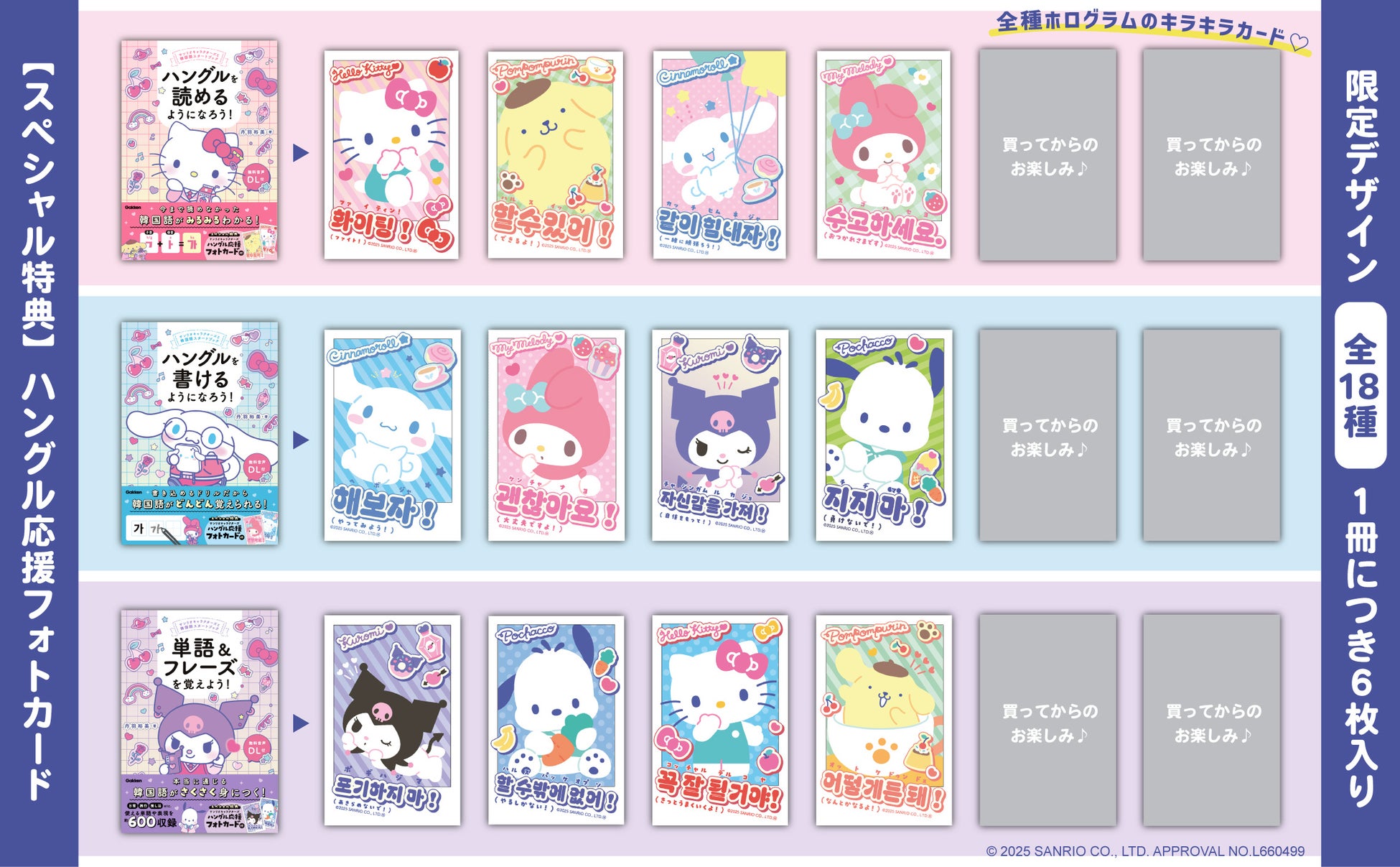 このシリーズには、1冊につき6種類の【サンリオキャラクターズ ハングル応援フォトカード】が付いています。全18種、全てホログラム仕様のキラキラカードです。
