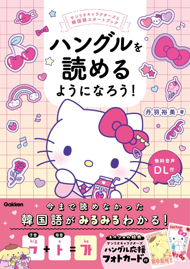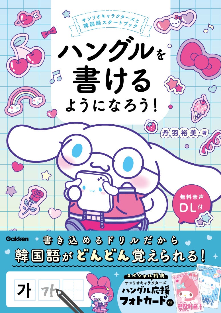 はじめての韓国語学習にぴったり! サンリオキャラクターズと楽しくハングルを学べるシリーズが新登場。わかりやすい解説やキャラクターのイラストで、ハングル文字や単語がみるみるわかる。6種類のカード付き。