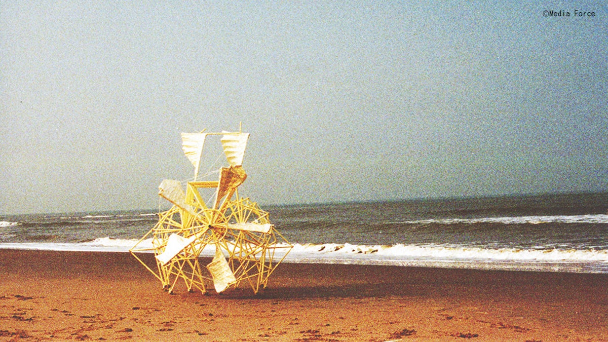 その不思議な“生きもの”は、オランダのアーティスト、テオ・ヤンセンがつくる「ストランドビースト」という作品です。ストランドビーストとは、オランダ語の「ストランド(strand:砂浜の)」と「ビースト(beest:生命体)」を組み合わせた造語です。
