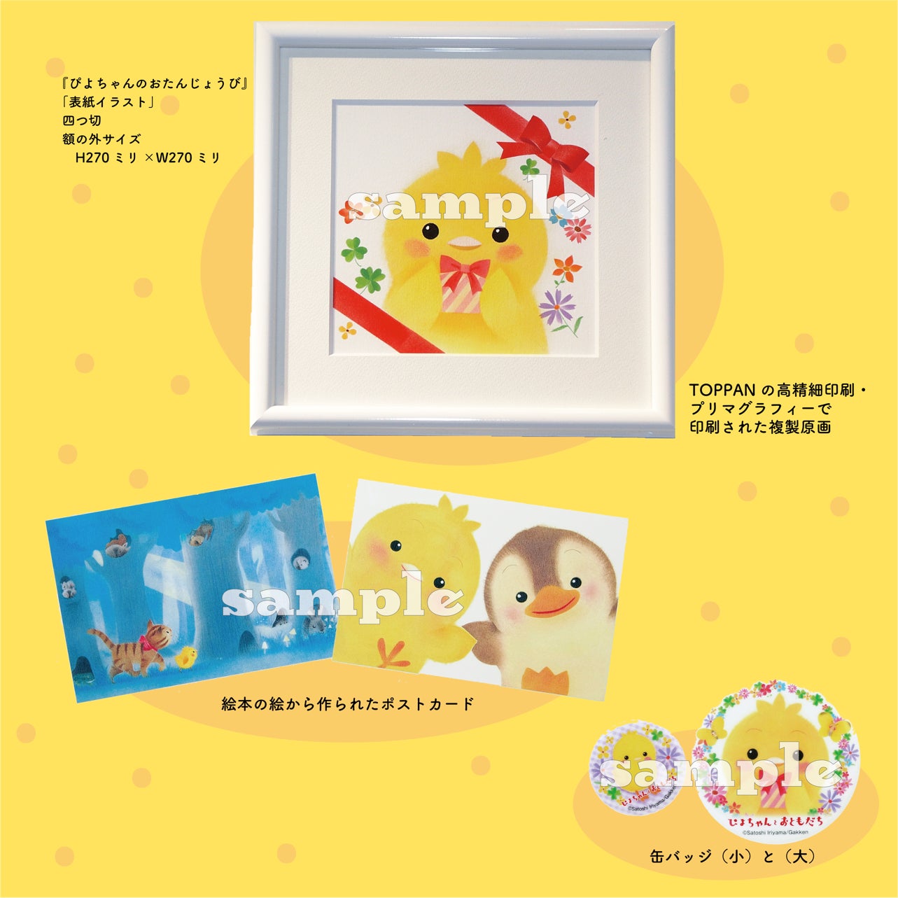 「ぴよちゃんえほん」シリーズのショップでは、複製原画や缶バッジ、ポストカードなどを販売しています。