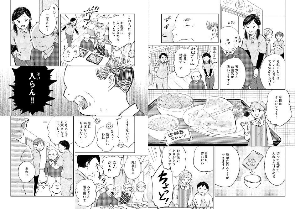 5巻は、幼馴染との将棋が趣味の入居者のお話。毎週金曜日の午前中、入居者の五木さんのもとに友人で幼馴染の小川さんが将棋を指しに来ます。ところが、ある日を境に小川さんが施設に顔を出さなくなりました。五木さんは、しばらくひとりで将棋を指していましたが、しだいに元気がなくなっていきます。それから、1か月が過ぎた頃、杖をついた小川さんが施設に顔を出しました。