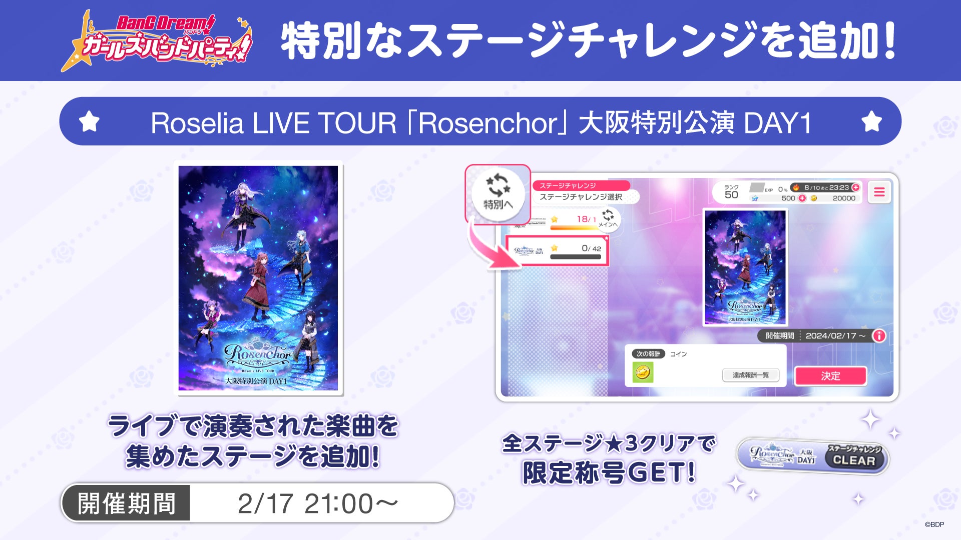 Roselia LIVE TOUR「Rosenchor」大阪特別公演の開催を記念し、オリジナル楽曲「VIOLET LINE」をスマートフォン向けゲーム「バンドリ! ガールズバンドパーティ!」内に追加いたしました。