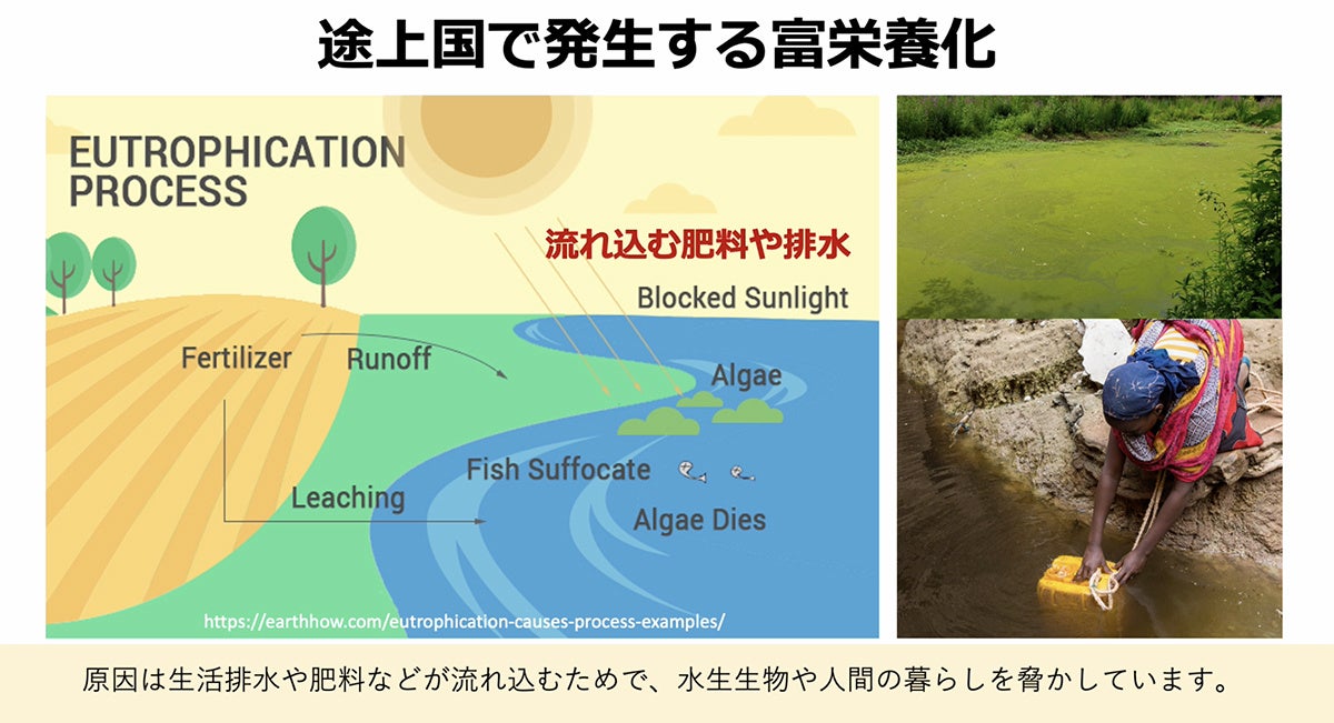 「肥料の高騰」と、開発途上国で生活排水などによって発生する「富栄養化池沼」の問題に向き合った皆さん。「富栄養化の原因である過剰な窒素やリン酸は植物にとっては栄養分である」という点に着目し、富栄養化した水を濃縮して液体肥料にする技術を開発するべく実験を重ねました。