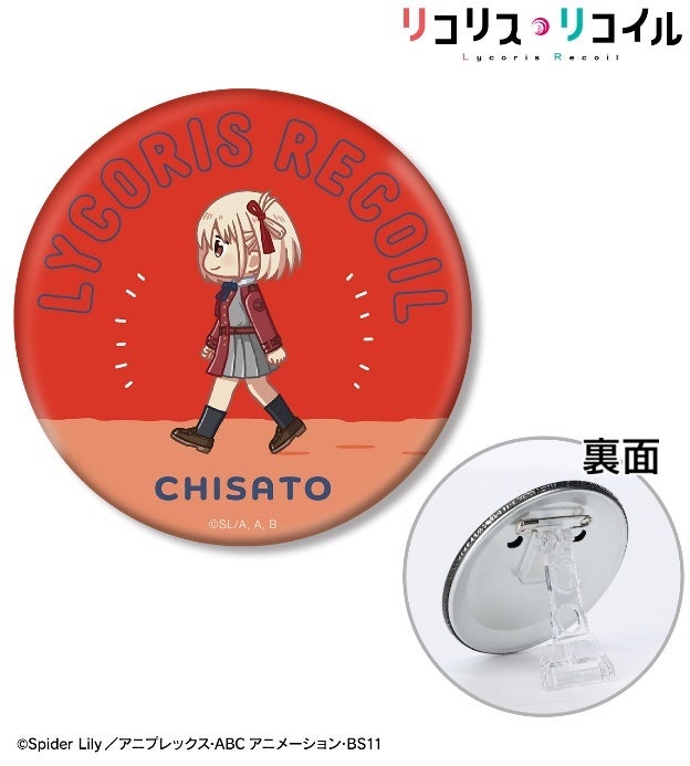 錦木千束、井ノ上たきな、中原ミズキ、クルミ、ミカ、真島、ロボ太、吉松シンジが歩いているちびキャラを新たに描き起こし、マルチに使用できるアクリルスタンドバッジに仕上げました。