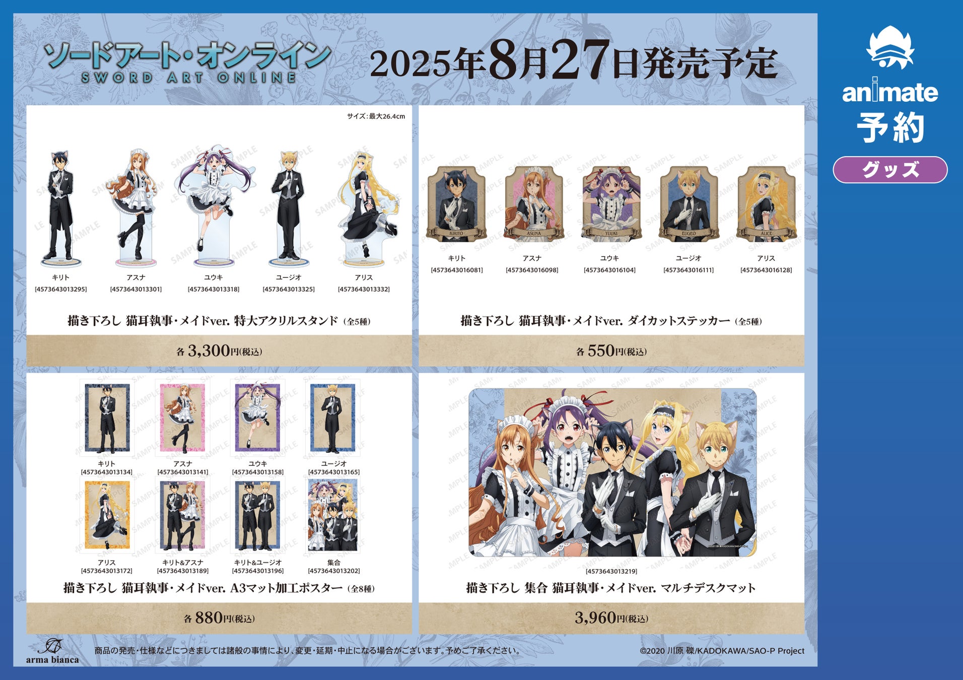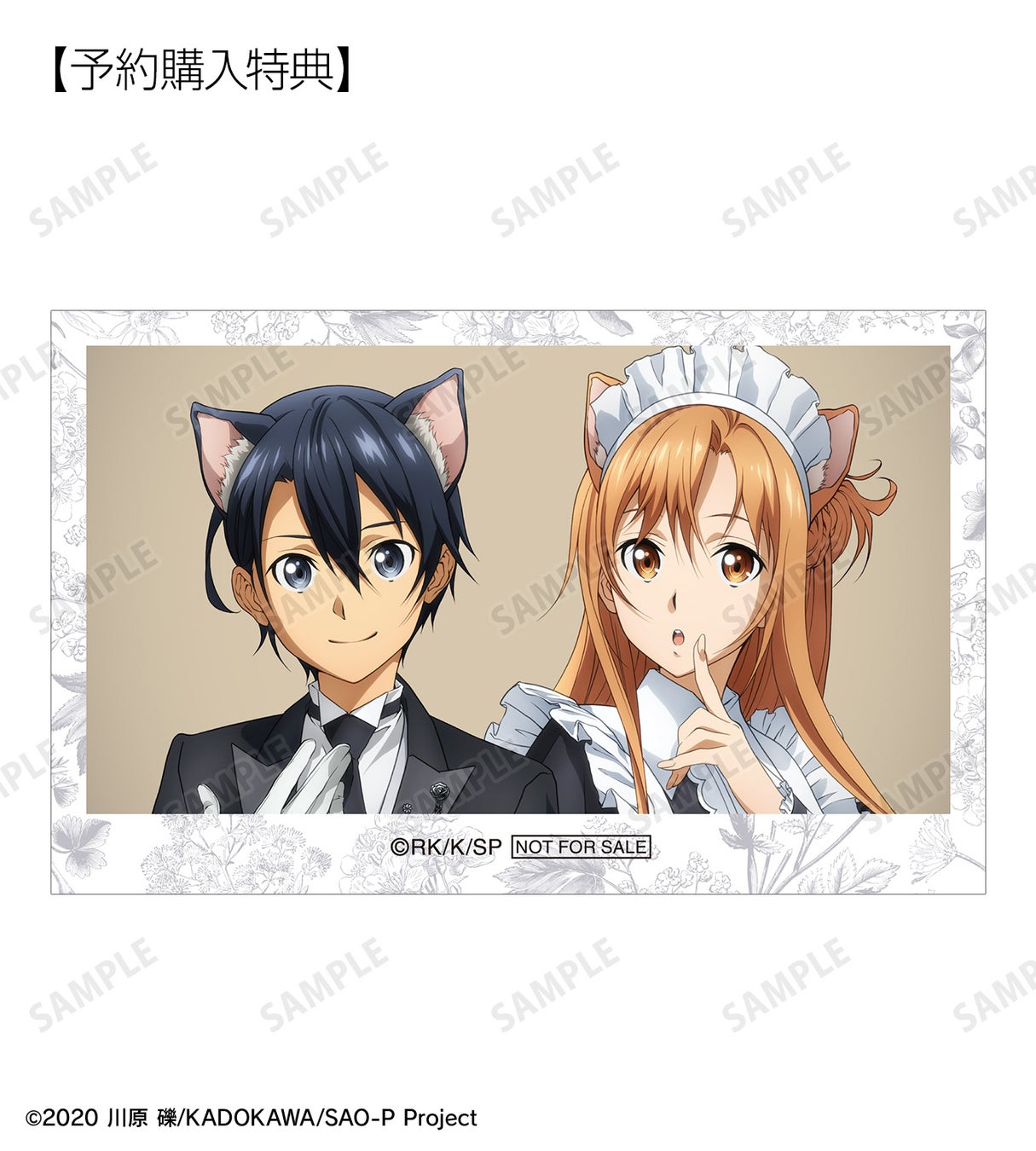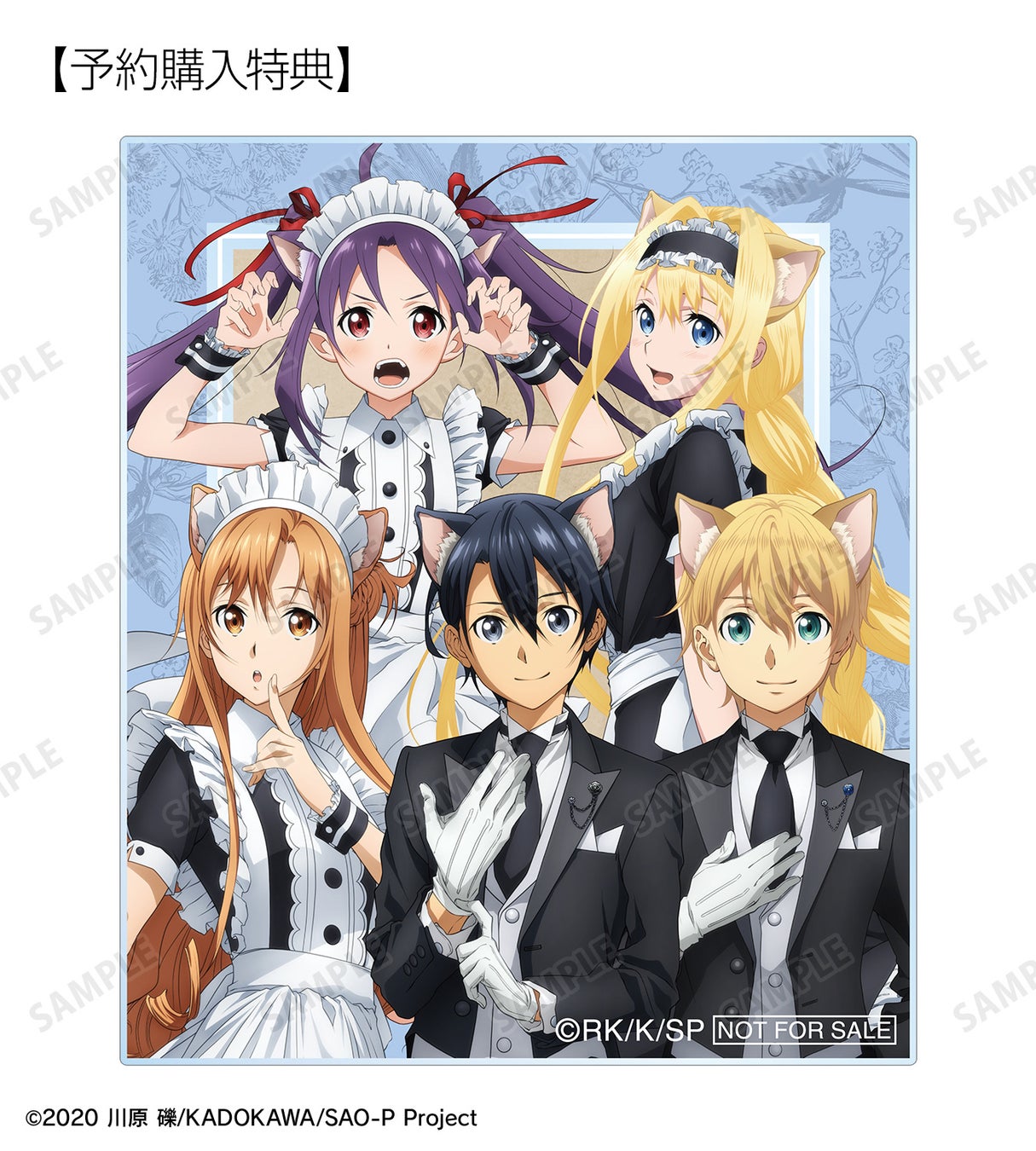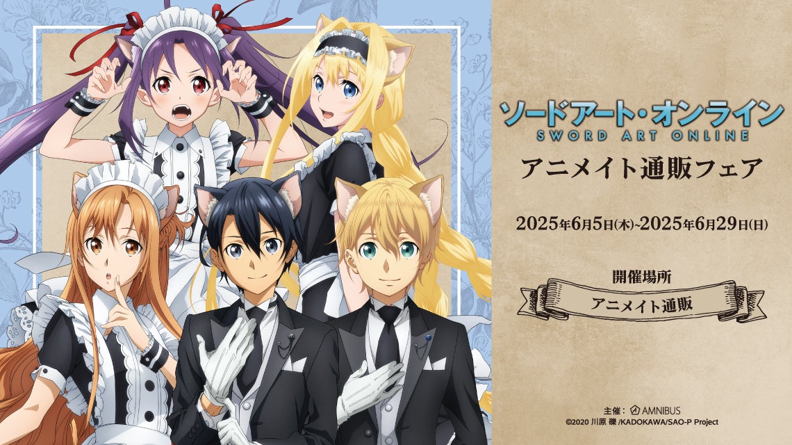 今回のフェアでは、『ソードアート・オンライン』の「猫耳執事・メイド」をコンセプトにした新規描き下ろしイラストを使用した新商品の先行予約を実施する他、フェア特典を予定しております。