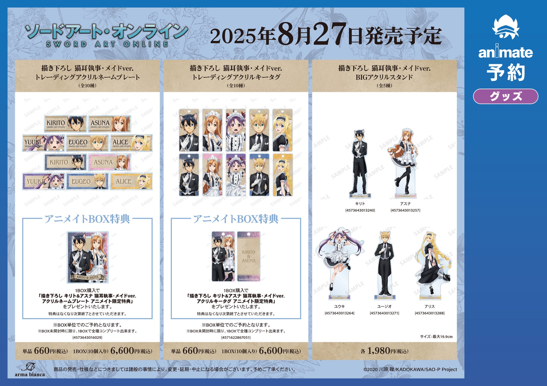 ※6月30日(月)より予約開始予定のECサイト「AMNIBUS」では、BOX購入特典として「描き下ろし キリト&ユージオ 猫耳執事・メイドver. アクリルキータグ AMNIBUS限定特典」を予定しております。